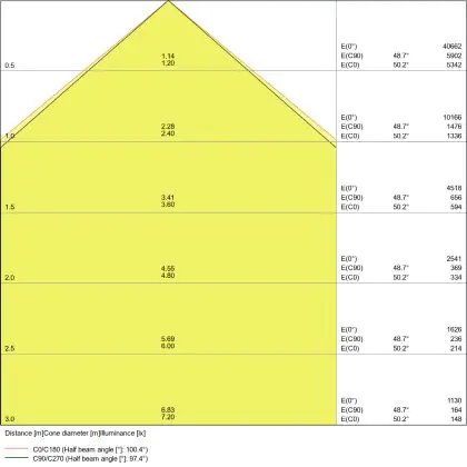 Beispiel: Wird eine Lampe mit einem Abstrahlwinkel von 60 Grad an der Decke (2,5 m Höhe) angebracht, erzeugt sie einen Lichtkegel von 2,9 Metern Durchmesser. Hat die Lampe hingegen einen Abstrahlwinkel von 120 Grad, beträgt der Lichtkegel 8,7 Meter im Durchmesser. |