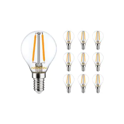 Die Mehrfachpackung 10x Noxion Lucent Lustre LED E14 Kugel Fadenlampe Klar 2.5W 250lm - 822-827 Dim To Warm | Dimmbar - Ersatz Für 25W ist eine effiziente E14 LED-Lampe mit Retrodesign und der perfekte Ersatz für Ihre konventionellen 25W Lampen mit E14. Zudem strahlt sie Licht in der Farbtemperatur 2700K - Extra Warmweiß aus und punktet durch eine lange Lebensdauer.