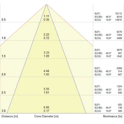 Beispiel: Wird eine Lampe mit einem Abstrahlwinkel von 60 Grad an der Decke (2,5 m Höhe) angebracht, erzeugt sie einen Lichtkegel von 2,9 Metern Durchmesser. Hat die Lampe hingegen einen Abstrahlwinkel von 120 Grad, beträgt der Lichtkegel 8,7 Meter im Durchmesser. |