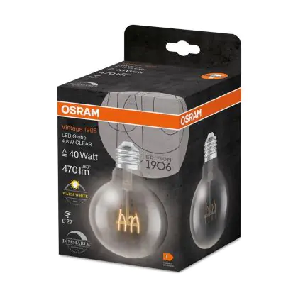Die Osram Vintage 1906 LED E27 Globe Fadenlampe Klar 4.8W 470lm - 827 Extra Warmweiß | Dimmbar - Ersatz Für 40W ist eine effiziente E27 LED-Lampe mit Retrodesign und der perfekte Ersatz für Ihre konventionellen 40W Lampen mit E27. Zudem strahlt sie Licht in der Farbtemperatur 2700K - Extra Warmweiß aus und punktet durch eine lange Lebensdauer.