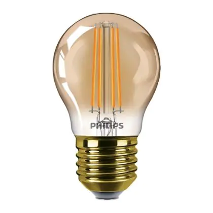 Die Philips Classic LEDluster E27 P45 5W 822 Gold ist eine goldbeschichtete LED-Lampe mit einem gängigen E27-Sockel. Sie zeichnet sich durch eine hohe Effizienz aus, ist dimmbar und ermöglicht Energieeinsparungen von 90 %. Sie hat eine Farbtemperatur von 2.200 K (extra Warmweiß) und eine lange Lebensdauer von 5 Jahren. Die Filamente im Lampeninneren, sowie die ansprechende P45-Form, erzeugen einen schönen Retro-Look wie zu Glühbirnen-Zeiten.
