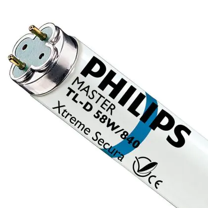 Die Philips MASTER TL-D Secura Xtreme 58W - 840 Kaltweiß | 150cm ist eine Leuchtstoffröhre mit einer Länge von 1500 mm. Das Produkt hat einen Durchmesser von 28 mm. Die Röhre strahlt Licht in der Farbtemperatur 4000K - Kaltweiß aus und punktet durch eine lange Lebensdauer.